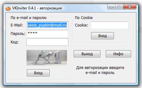 VKInviter 0.4.1 - программа, предназначенная для автоматического массового приглашения пользователей в вашу группу или на встречу в контакте. Можно приглашать случайных людей, людей по определенному критерию, участников группы или встречи в контакте. Всего одним нажатием можно пригласить всех своих друзей Использование списка аккаунтов позволяет обойти ограничения на 40 приглашений в день. Также программа сохраняет id всех людей, которым высылала приглашения и, если встречает их еще раз, пропускает. |
